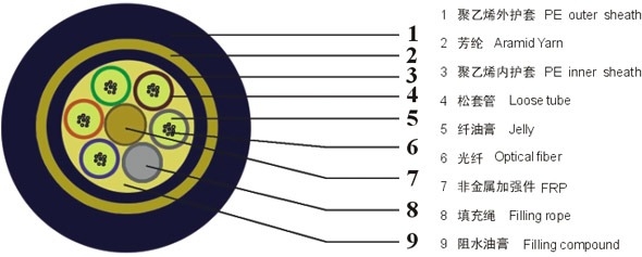 ADSS cable is loose tube stranded. The fibers are positioned in a loose tube made of a high modulus plastic. The tubes are filled with a water-resistant filling compound. The tubes(and fillers)are stranded around FRP as a non-metallic central strength member into a compact and circular cable core. After the cable core is filled with filling compound, it is covered with thin PE inner sheath. After stranded layer of aramid yarns are applied over the inner sheath as strength member, the cable is completed with PE or AT outer sheath.